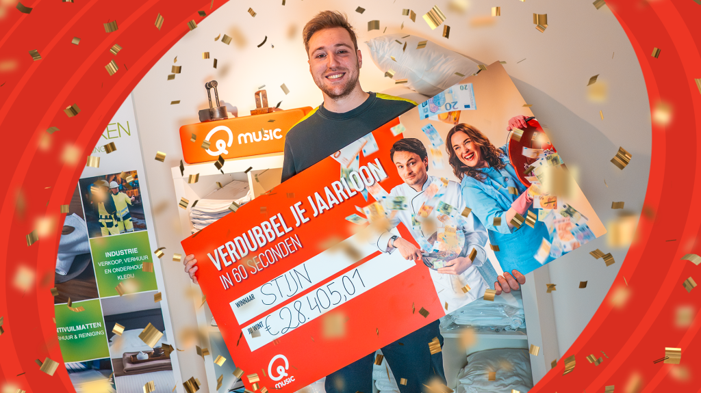 Stijn was de twaalfde luisteraar die live bij Qmusic een poging waagde om zijn jaarloon te verdubbelen met de actie ‘Verdubbel je jaarloon in 60 seconden’ en is de eerste luisteraar die daar ook effectief in slaagt. In de Q-app konden luisteraars een oefenquiz spelen, deze werd in totaal maar liefst 388.729 keer gespeeld.Vanaf woensdag 4 februari spelen Maarten en Dorothee verder en kunnen luisteraars iedere werkdag om 9.30 uur hun netto maandloon verdubbelen. Wie wil meespelen, kan zich via de Q-app inschrijven voor ‘Verdubbel je loon in 60 seconden’. Oefenen kan ook nog steeds met de oefenquiz in de Q-app.Het is gebeurd! Luisteraar Stijn Sanspeur (27) uit Oostrozebeke heeft ‘Verdubbel je jaarloon in 60 seconden’ gewonnen bij Maarten en Dorothee op Qmusic. Hij wordt in één klap 28.405 euro rijker.