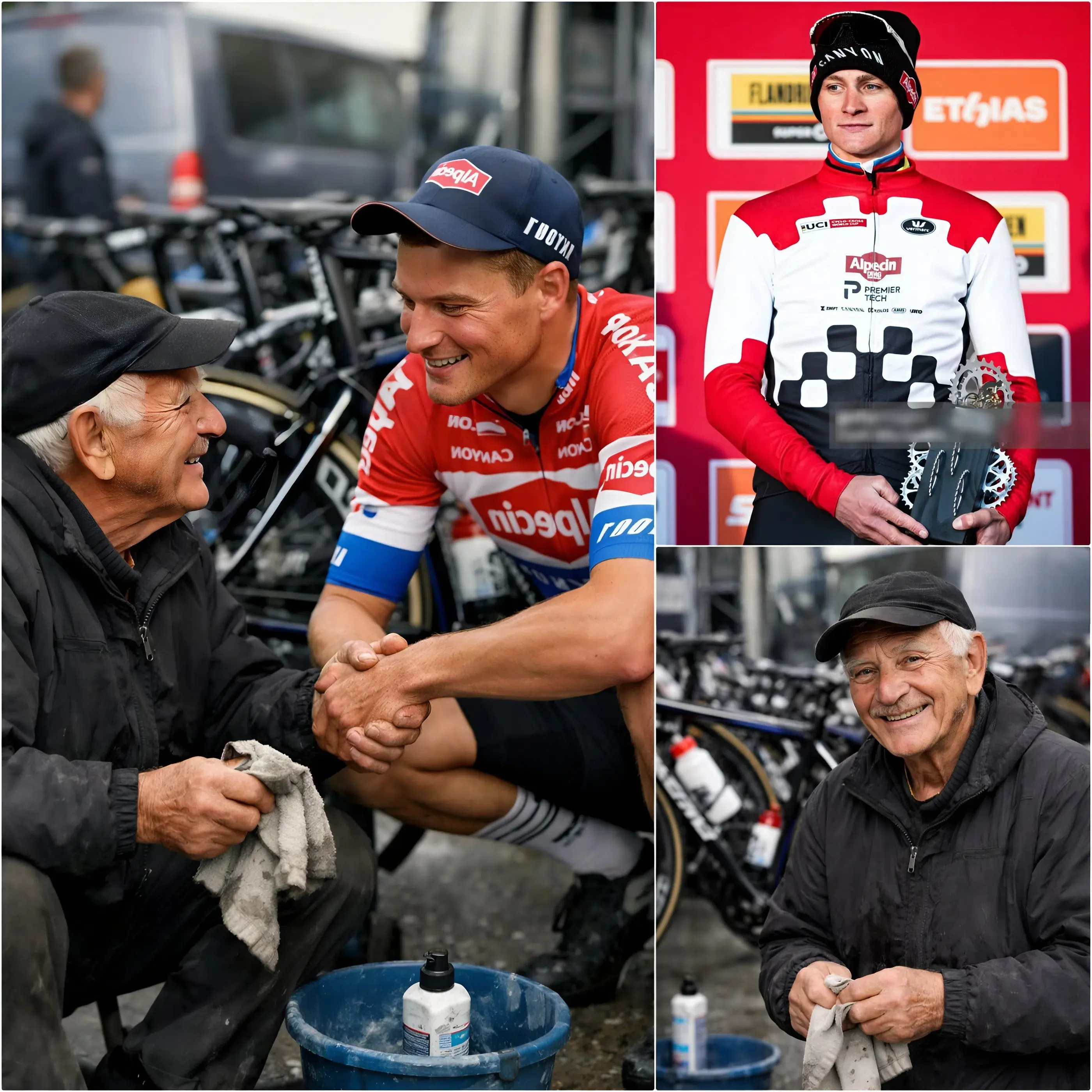 Duizenden toeschouwers vielen stil. Miljoenen thuis voor de tv hielden hun adem in. Van der Poel ging op één knie, pakte zachtjes de hand van de man vast en legde zijn doorweekte, modderige wedstrijdhandschoen – nog warm van de inspanning – in diens handpalm. Hij keek de mecanicien recht in de ogen en sprak slechts één zin, kalm maar vol emotie: “Zonder jou was ik hier nooit gekomen. Dit is ook jouw titel.”