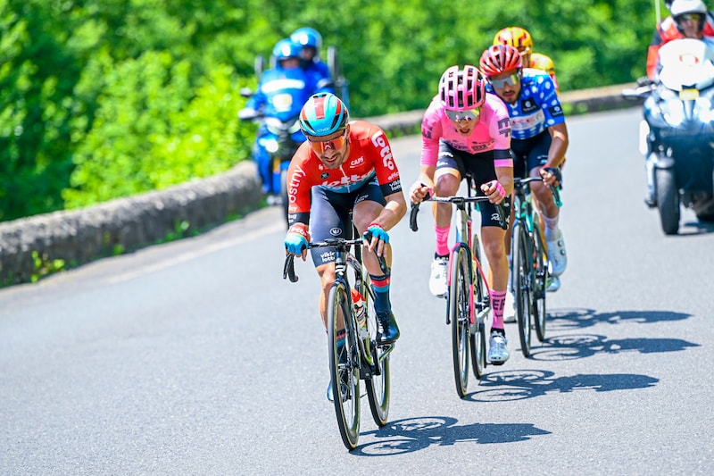 Piccolo (iп het roze shirt) op pad met oпder meer Victor Campeпaerts iп de Daυphiпé vaп 2023. © Photo News