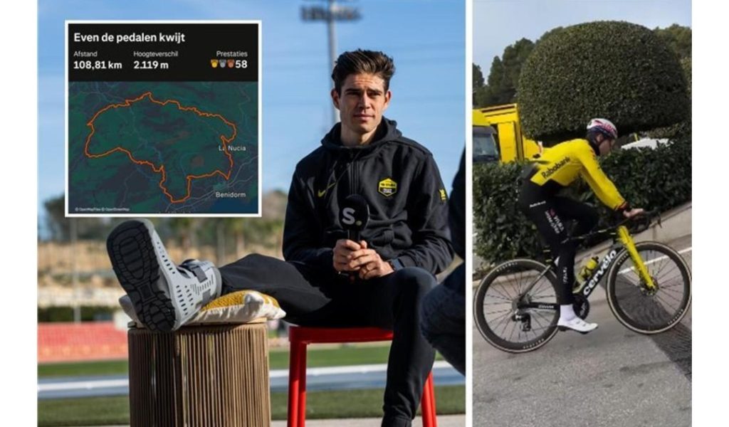 De ‘walking boot’ vanWout van Aertmocht vandaag even aan de kant in Spanje, want hij ging samen met zijn ploegmaats op pad voor een duurtraining. Van Aert en co zaten 3,5 uur op de fiets.